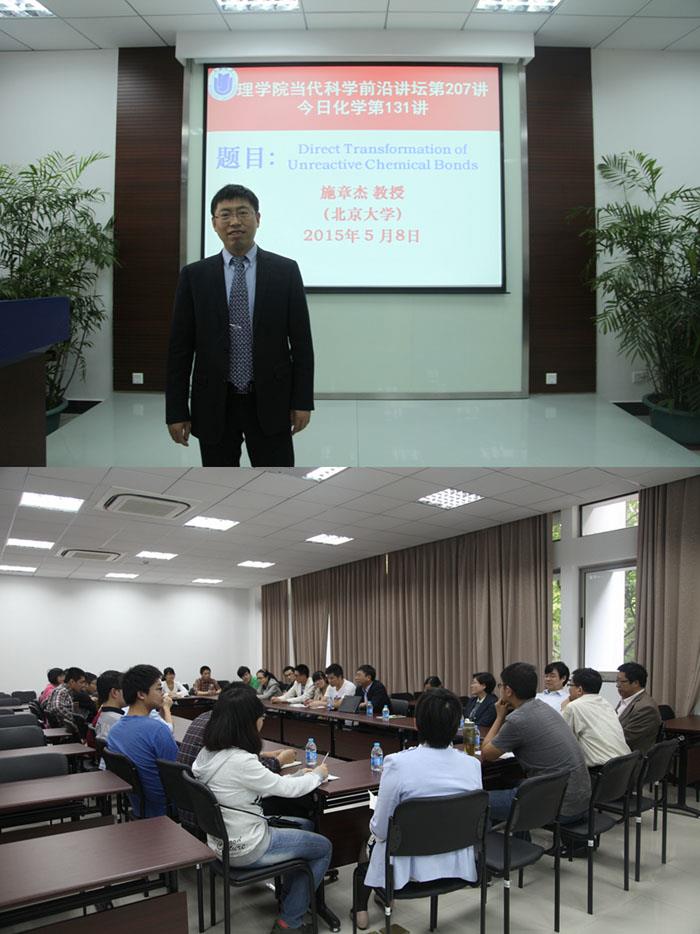 我校自强教授、北京大学化学与分子工程学院施章杰教授于近日访问理学院。5月8日上午,在校本部HA102,施教授作了题为“非活性化学键的直接转化”的学术报告,该报告是理学院“当代科学前沿”讲坛第207讲、化学系“今日化学”第131讲。化学系主任许斌教授主持报告会,系党总支书记陈雅丽教授、化学系部分教师、研究生等80余人参加了学术报告会。