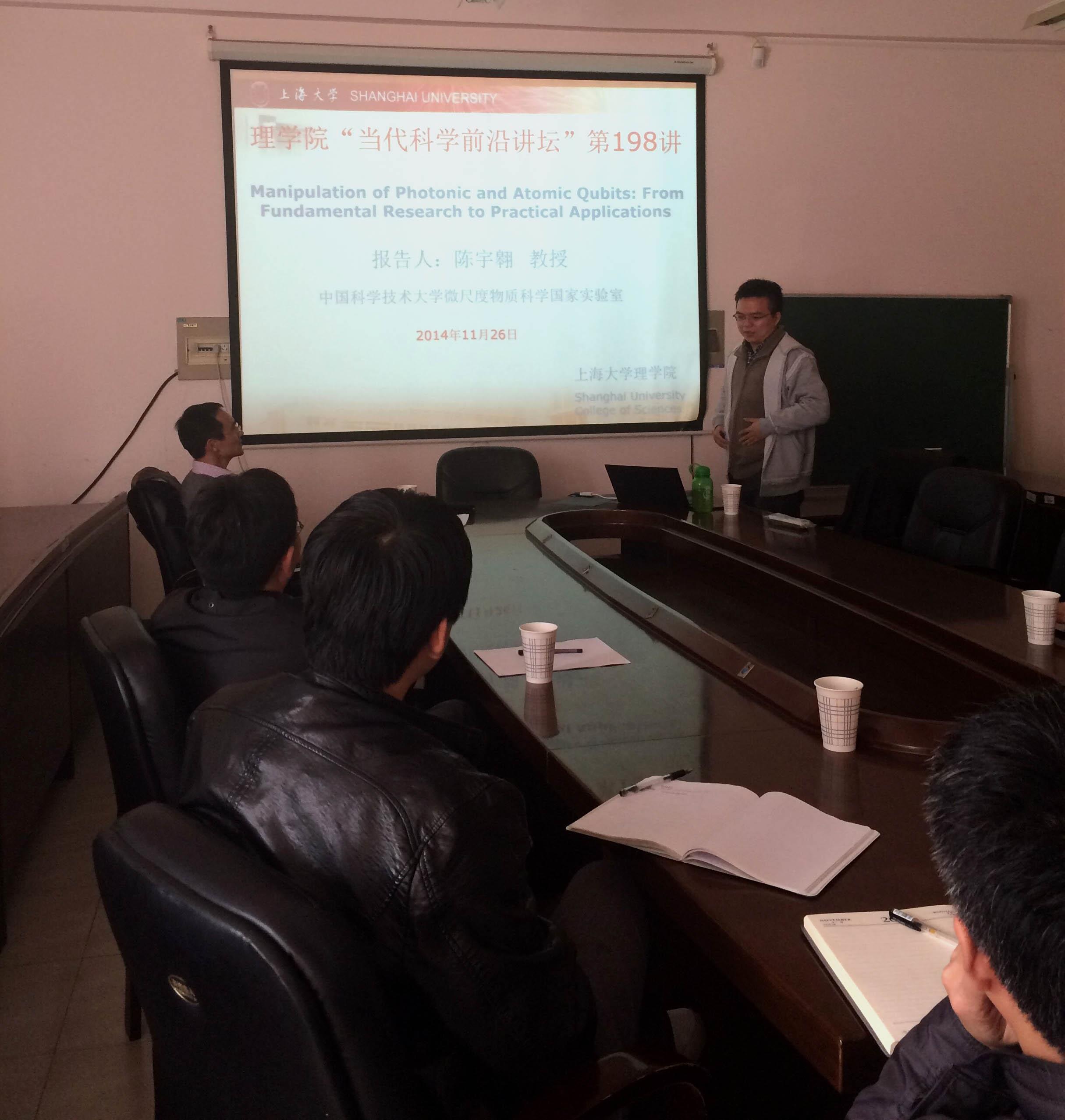 2014年11月26日下午,中国科学技术大学“青年千人”陈宇翱教授应邀莅临理学院,在校本部G309给师生们作了题为“Manipulation of Photonic and Atomic Qubits: From Fundamental Research to Practical Applications” 的精彩学术报告,报告由理学院杨希华教授主持,李春芳教授、马国宏教授、陈玺教授、任伟教授、Jeffrey Reimers教授和葛先辉教授等理学院教师以及研究生参加了报告会。该学术报告为理学院“当代科学前沿讲坛”第198讲。